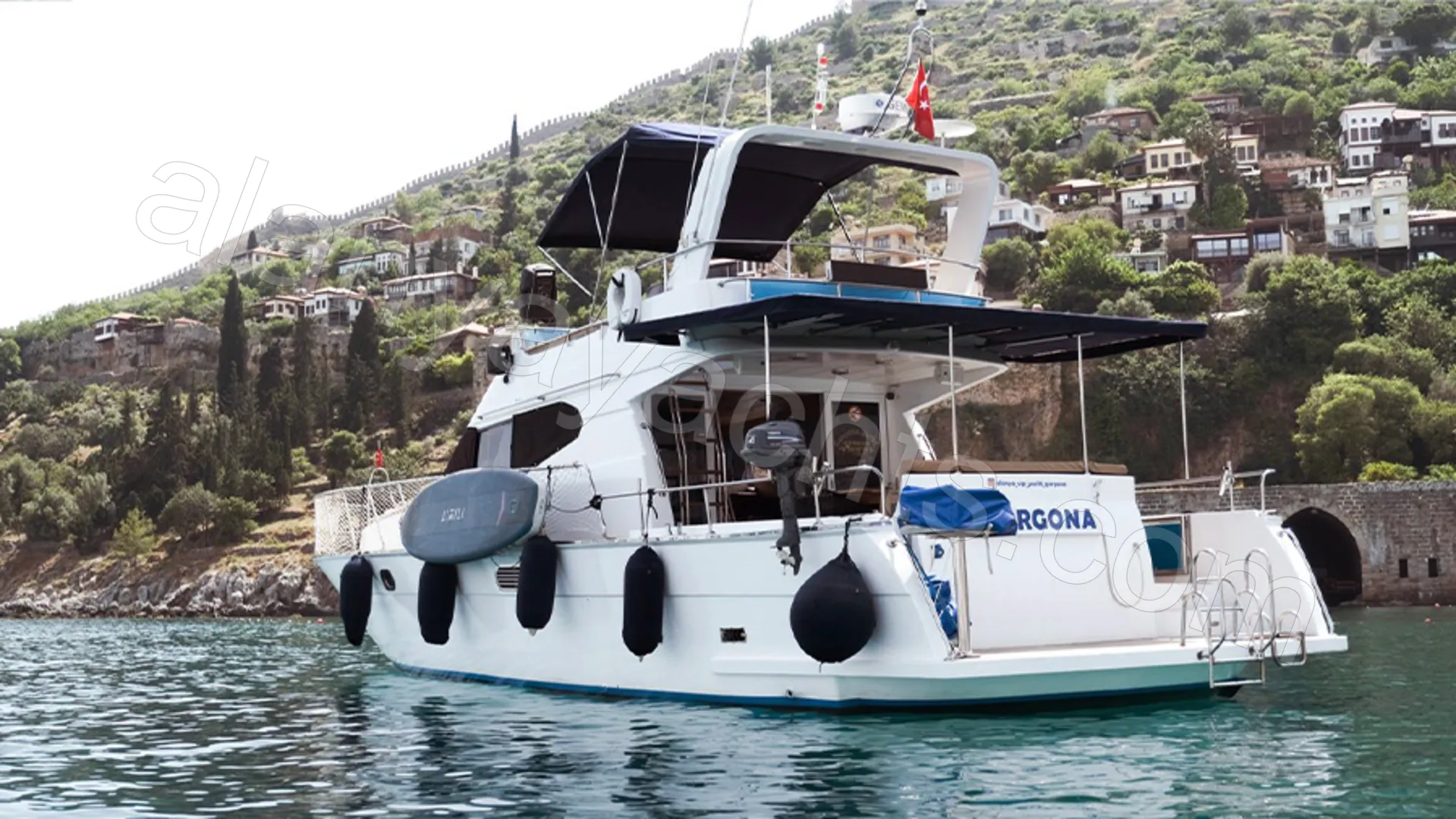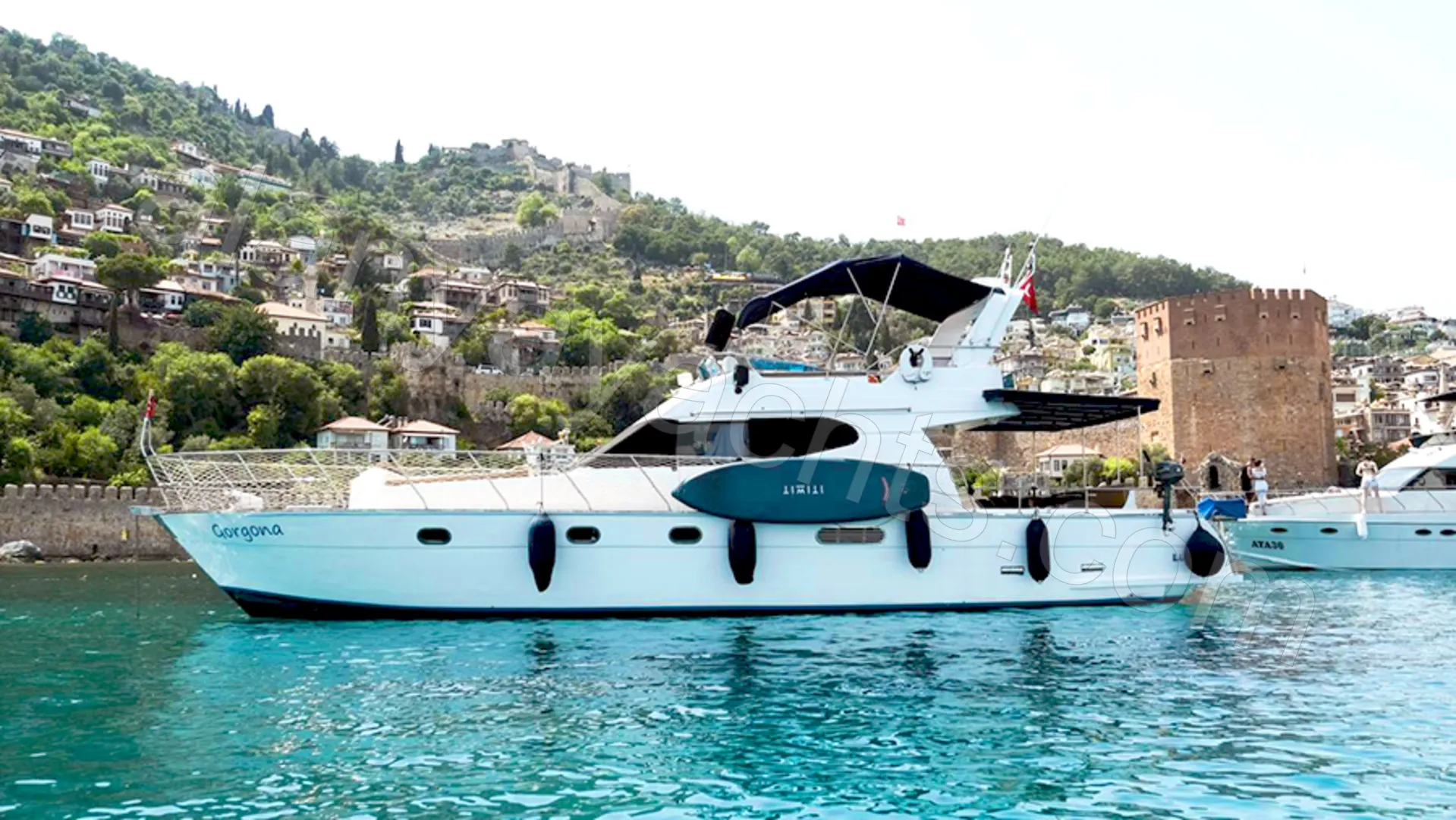 Gorona-yachten, fortøyd i Alanya havn, kombinerer komfort og sikkerhet. Perfekt for grupper som ønsker et rimelig, men elegant cruise.
