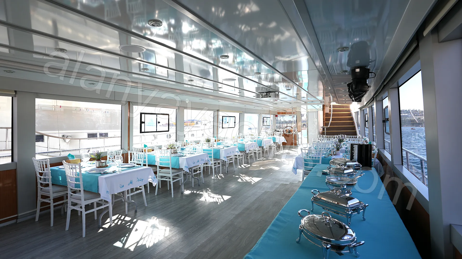 Talia's laser system can write names or personal messages on the night sky — a feature that makes marriage proposals truly unique. During the evening programme, which begins at sunset, moments experienced on the water against the backdrop of the city lights become memories for a lifetime. The white Chiavari chairs, turquoise accents and silver table setting on deck create a natural studio environment for photography.