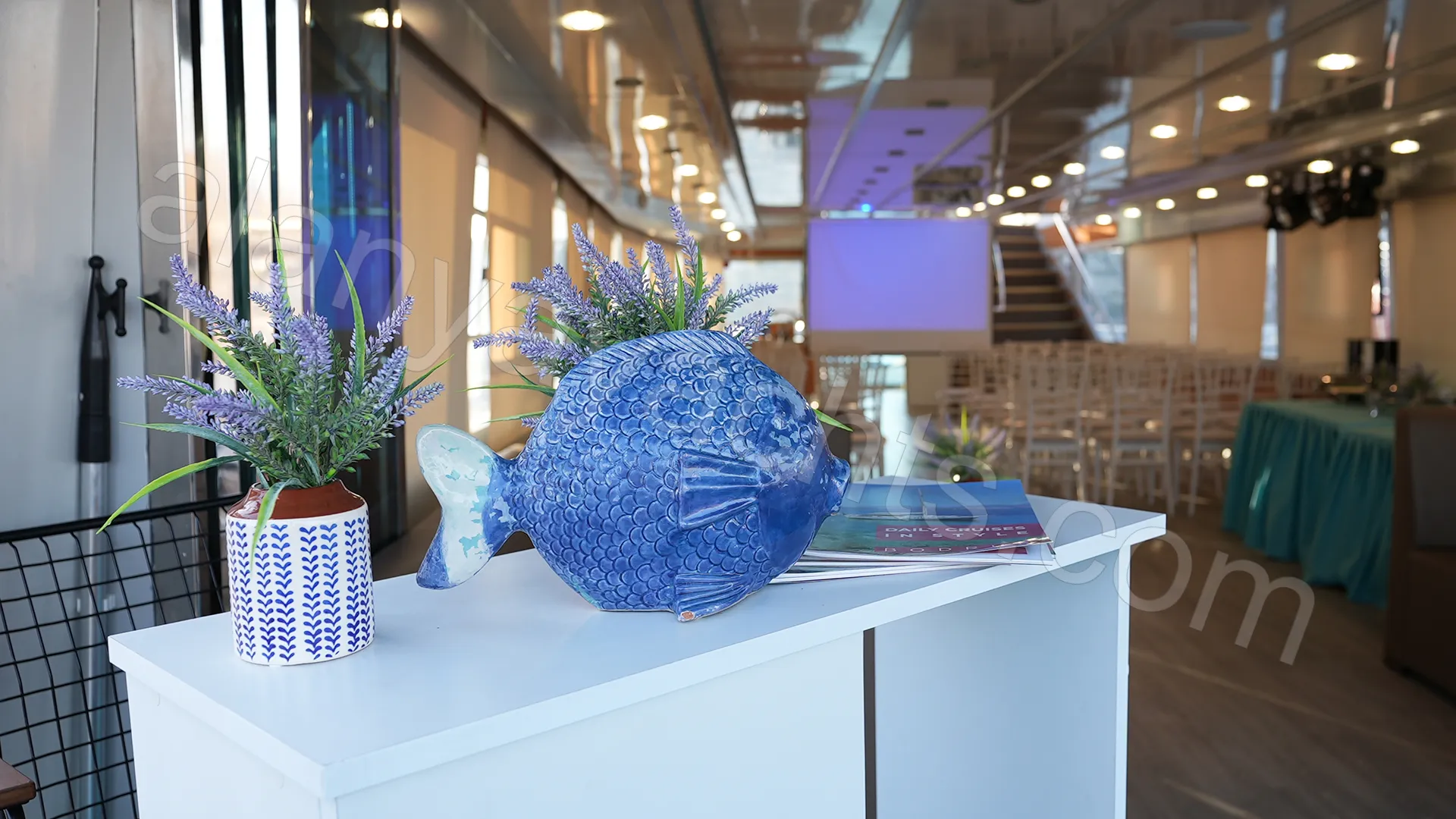 The restaurant deck transforms into a banquet hall for 70 guests with white Chiavari chairs, embroidered tablecloths and silver chafing-dish service. In theatre configuration it serves as a presentation and conference venue. Cocktail tables, decorative lighting and bespoke floral arrangements bring each event to life in a different concept.