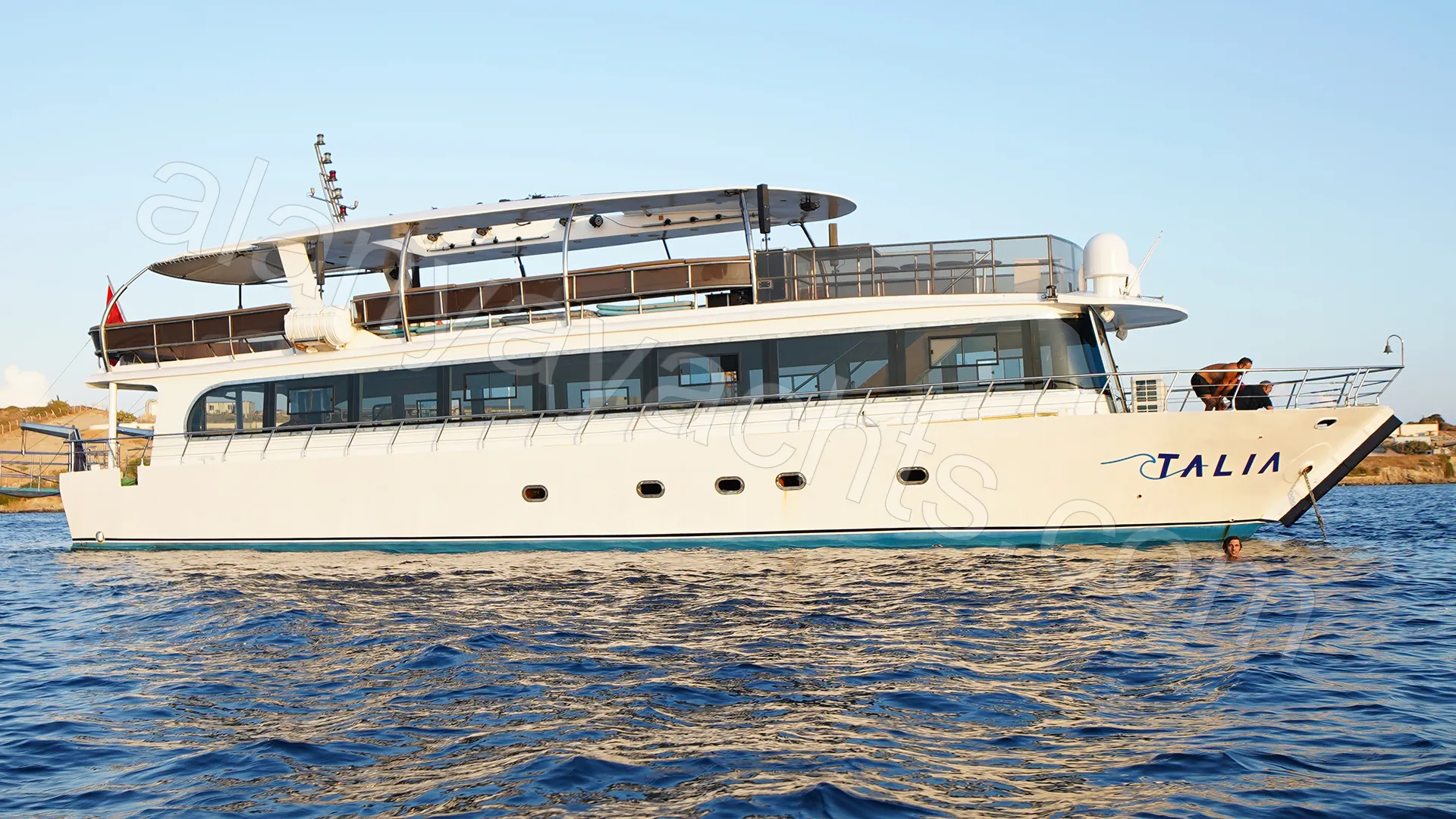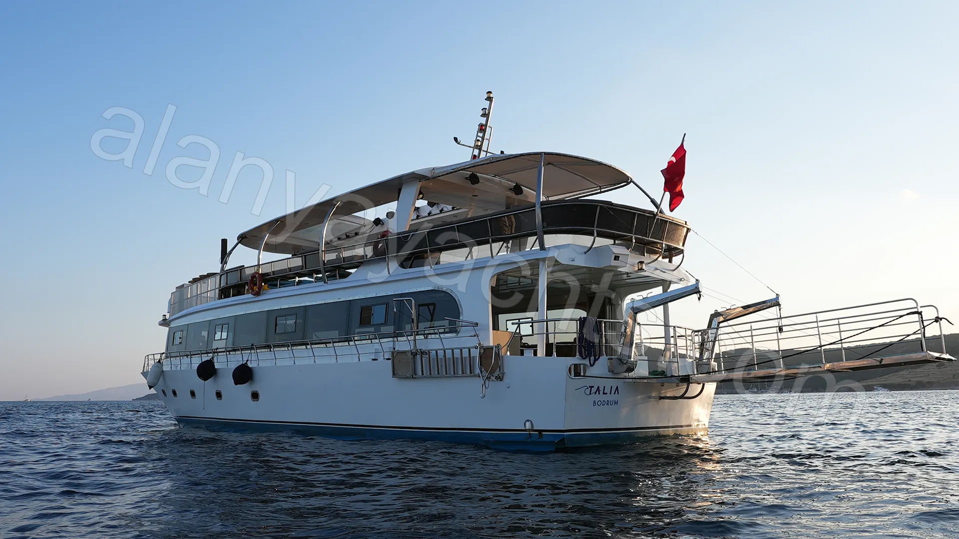 Private yacht charter Alanya: 24m Talia yacht, 70 guests, weddings, engagements, corporate events. Professional sound, lighting, laser system and chef menu for unforgettable moments at sea.
