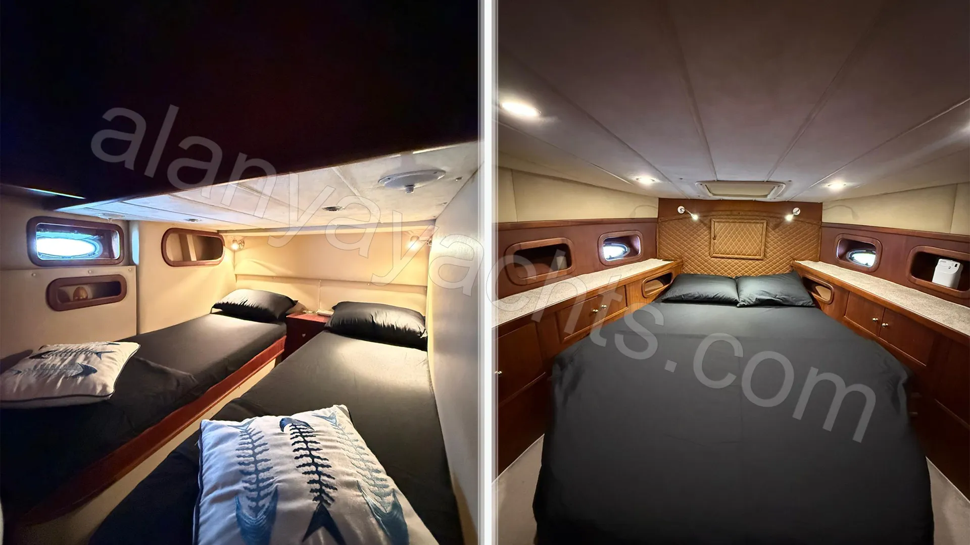 Yattaki jeneratör ve klima sistemi sayesinde en sıcak yaz günlerinde bile kabin içi ve dış mekânlarda ferah bir ortam sağlanır. Güneşlenme terası, kablosuz internet, televizyon ve cep telefonundan müzik bağlantısı gibi donanımlar, denizde geçirdiğiniz her anı keyifli kılar.